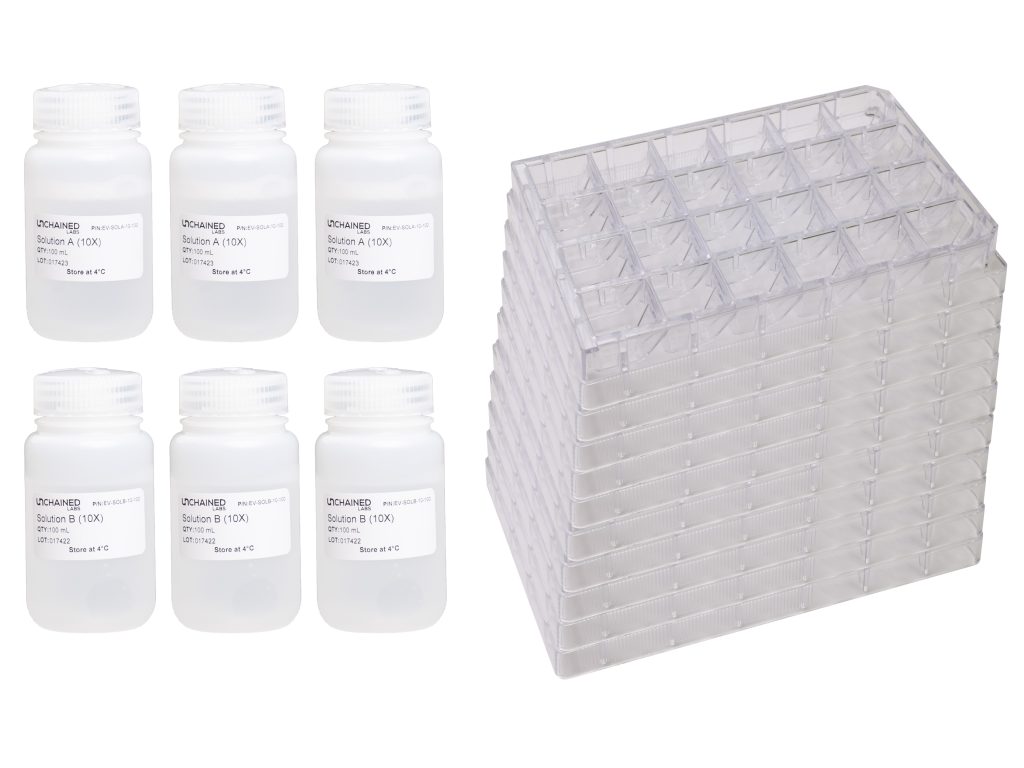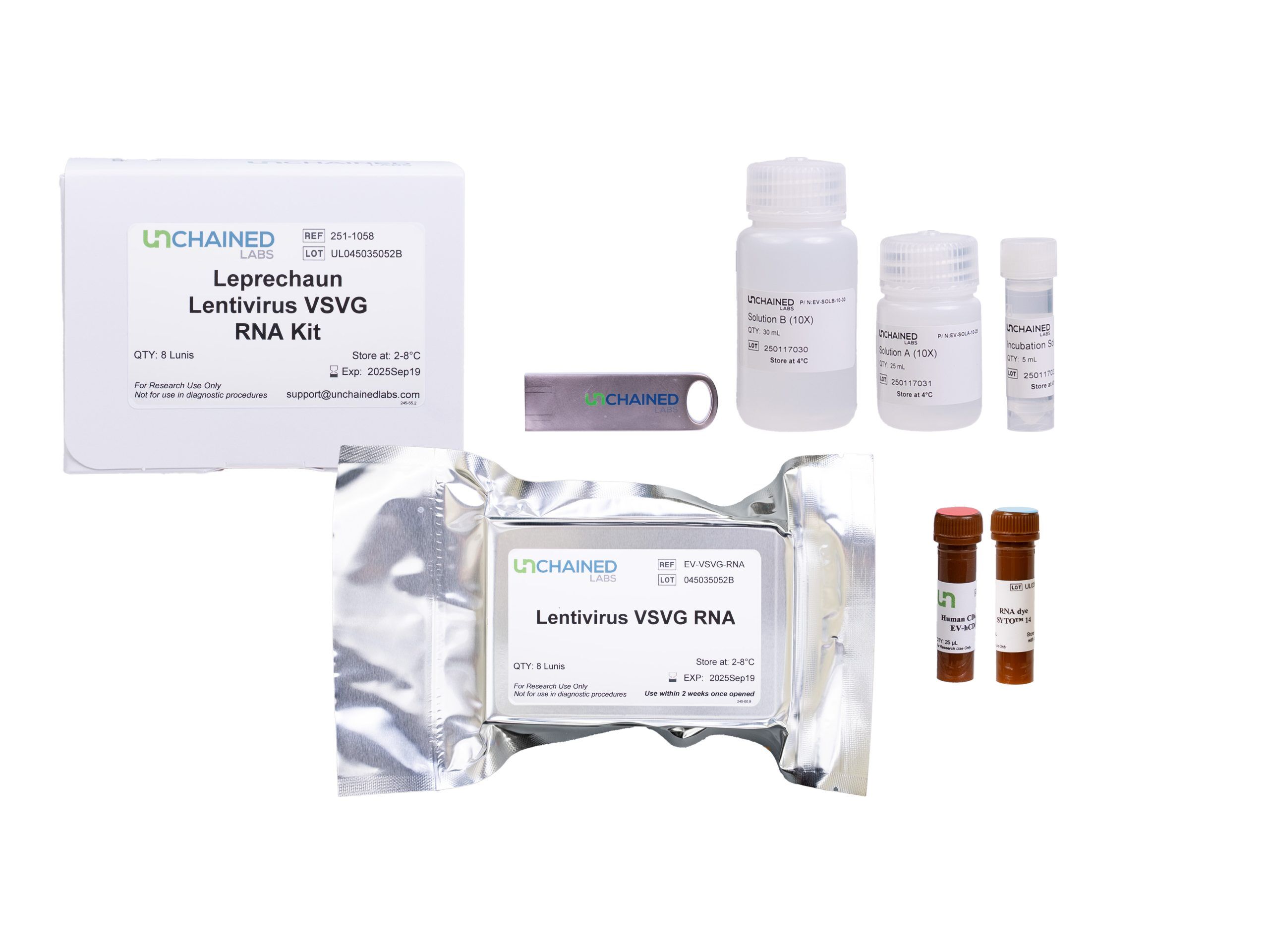 Lentivirus VSVG RNA Kit. Contains 8 Lunis with anti-VSVG, anti-p24, and IgG control spots, and anti-p24-CF647 and SYTO 14 RNA dye. Contains 1 x Incubation Solution (10x) 10 ml, 1 x Solution A (10x) 25 ml, 1 x Solution B (10x) 30 ml.